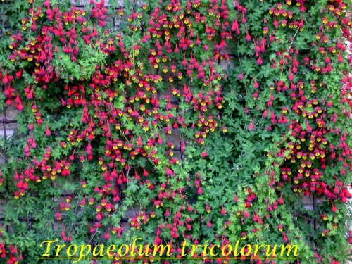 Tropaeolum is a genus of about 80 species native to South America in the Tropaeolaceae family. The common nasturtium (Tropaeolum majus) is the most easily encountered member of this family. Some of the species have tuberous or rhizomatous rootstocks. The bright flowers of quaint shapes are usually freely produced on long stalks and the rapid growth of many of the climbers renders the Tropaeolum a very useful and decorative plant for many purposes. Species from the coastal areas and many from the lowland foothill areas of the Andes are winter growers and those that are true alpine are summer growers.