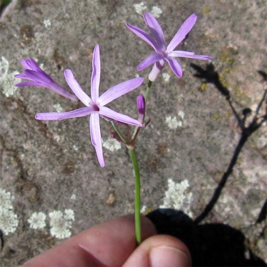 Tulbaghia galpinii Schltr. is a tiny species with greenish-white to pinkish flowers. It starts growth in the spring and flowers early summer. This plant is quick to bloom from seed and easy to grow, and as Mark McDonough said in a PBS list post, "For those who admire small and inconspicuous bulbous plants, this is IT!". The species also produces seeds without needing to be pollinated. Height: 12 cm. Photos 1-3 were taken by Cameron McMaster. The last was taken in Andriesberg.