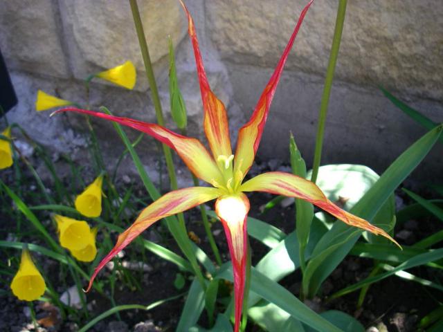 Tulipa clusiana var. chrysantha (A.D.Hall) Sealy shown in the first two photos was purchased as Tulipa chrysantha Boiss. Most databases are no longer recognizing this form as deserving variety status. It has however received the RHS award of garden merit (as var. chrysantha). This form of Tulipa clusiana originally was sold as a yellow form of Tulipa montana. It is a nice small tulip for the rock garden. The flowers only open after an hour or more of bright light, and are truly striking when stretched wide and flat to greet the sun, the inside showing none of the red coloration evident on the outside of the flower. The first photo shows the plant at early anthesis with the strong red color on the exterior of the outer tepals. Tulipa linifolia can be seen behind the featured tulip, the buds just showing at the base. Buds and the undulate leaves of Tulipa linifolia can be seen in the upper right behind the featured tulip in the second photo. Photos 3-4 are views of Tulipa clusiana var. chrysantha flowering along with the brilliant red Tulipa linifolia taken on May 10, 2003. The red backs to the bright yellow Tulipa clusiana var. chrysantha show well here. Both need a couple of hours of full sun to open. Photos 1-4 by Mark McDonough. The fifth photo was taken by Hans Joschko.