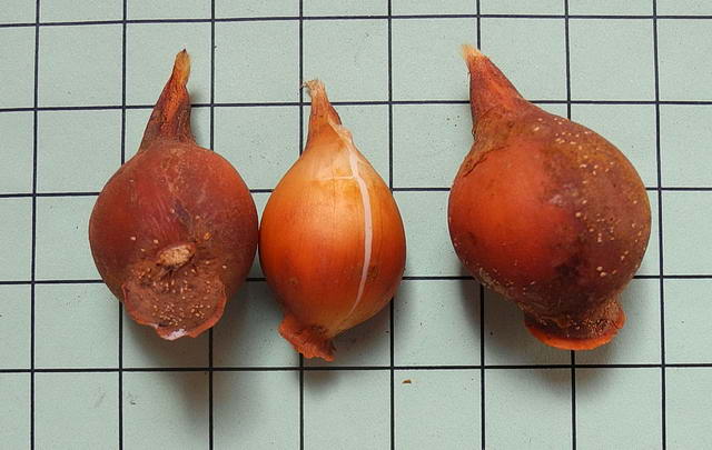 Photos below of bulbs received as Tulipa chrysantha and another species (wrongly named) that resemble photos on the Internet of tulips named Tulipa clusiana var. chrysantha 'Tubergen's Gem' or sometimes just Tulipa 'Tubergen's Gem' (clusiana group). 'Tubergen's Gem' is a tall form that has large yellow flowers with a bold red band on the back of the outer tepals. The last photo from Mary Sue Ittner shows the bulbs on a 1 cm grid.