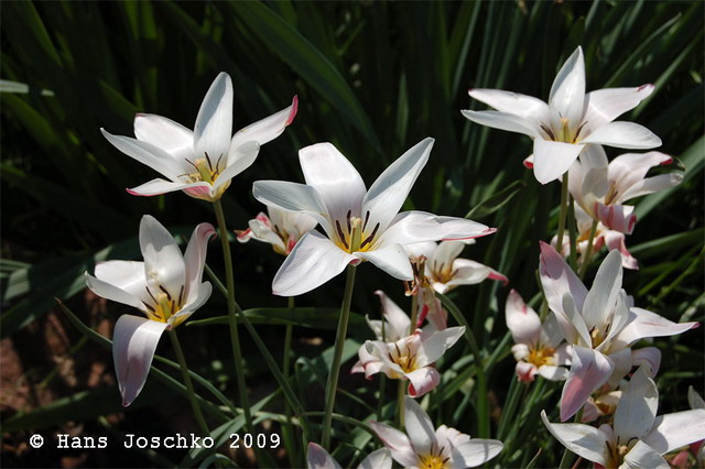 Tulipa clusiana Redouté is known as the Lady Tulip. This species is from Iran east to the western Himalaya. It is one of the few species that can naturalize in Mediterranean climates that do not have cold winters. The basic flower color is white (although there are forms of various shades of yellow) with the three outer tepals red with a pink band on the back. Inside the flower is a small purple blotch at the base of the tepals. The flowers are attractive when closed and when the sun shines the flowers open wide. This tulip grows from 13 to 30 cm. Bulbs have a tough tunic with a few hairs around the base and longer hairs at the neck, forming a thick felt that protrudes from the top of the base. The white form is not offered as often as some of the yellow forms. Photo 1 was taken by Arnold Trachtenberg, photos 2-3 by John Lonsdale, photo 4 by Mary Sue Ittner, and photo 5 by Hans Joschko of the cultivar 'Lady Jane', a recipient of the RHS award of garden merit. The last photo from Mary Sue Ittner shows the bulbs on a 1 cm grid.
