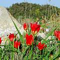 Tulipa agenensis Redouté is a widespread species from the Eastern Mediterranean to Jordan. Flowers are crimson red, with a yellow patch on the outside. Leaves are variable, either undulate or erect. It grows in different habitats from sea-level to about 2000 m. Photos 1 and 2 were taken by Oron Peri in the Mediterranean coastal area in North Israel. Photos 3 and 4 were taken by Shlomit Heymann in the Carmel mountains, late March 2011, the first winter after a fire.