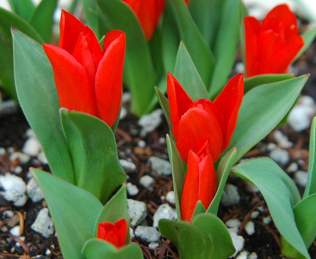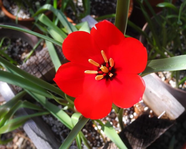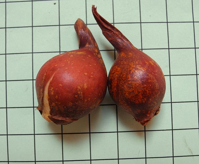 Tulipa linifolia Regel, native to Iran, Afghanistan, and the Pamir Alai of central Asia is a winner of the RHS award of garden merit. It is now considered to include Tulipa batalinii Regel. It is a variable species with red or yellow flowers and narrow leaves. The first photo is from Mark McDonough who wrote: It "is a terrific rock garden size tulip species, with gorgeous brilliant red flowers that open wide to catch the sun. The red color didn't photograph accurately and appears to have a magenta tone. T. clusiana var. chrysantha can be seen in the right side of the photo." The second picture by Max Withers gives a better idea of the color of this species. His plant was purchased from the UC Botanic Garden. Photos 3-5 from Mary Sue Ittner show a pot of flowers in 2008 and bulbs on a 1 cm grid.