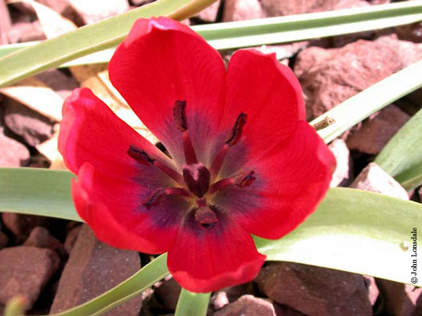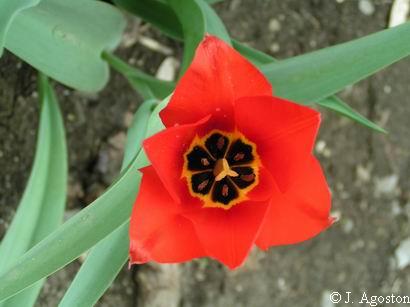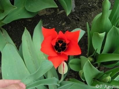 Tulipa fosteriana W.Irving is a robust species from Central Asia where it is found in deep, humus-filled pockets among rocks at altitudes of around 1700 m. It has broad leaves and large red flowers, often lined with black. It has been used in breeding of many garden cultivars, including these groups: Darwin Hybrid Group, Kaufmanniana Group, Greigii Group, and the group that most closely resembles this species, the Fosteriana Group.