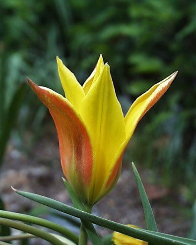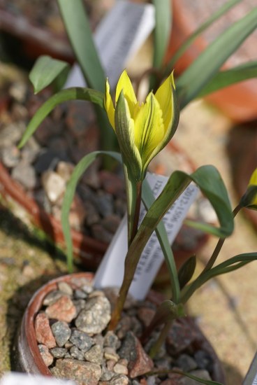 Tulipa ferganica Vved. is distributed in Central Asia where it grows on bare rocky hillsides. Growing from 15 to 25 cm tall, it has glaucous wavy-edged leaves and bright golden yellow flowers blushed darker on the outside. Grown in New Jersey, photos by Arnold Trachtenberg.