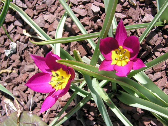 Tulipa humilis 'Eastern Star' is magenta-rose with a bronze-green flame and a canary-yellow base. The first two photos of it are from David Pilling of a bulb and the resulting plants in spring. Tulipa humilis 'Lilliput' is red with a violet base and more than one flower per stem. The third and fourth photo of it from John Lonsdale.
