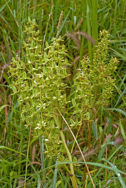 Veratrum virginicum (L.) W.T.Aiton , syn. Melanthium virginicum Linnaeus, occurs in wet prairies across much of eastern North America at low elevations. It must once have been abundant. Where I saw it, in Illinois, it is now confined by the corn desert to swampy road intersections and the un-farmed land alongside abandoned railroads. Horticulturally it is a very desirable species, which ought to be cultivated much more frequently. Unlike many Veratrum species, it flowers most years if well fed. The flowers that make up the large, paniculate inflorescence change in color as they age from white, through greenish to yellow. The filaments are persistent (see second image) and the seed capsules are the most decorative in the genus. These images were taken by Tom Mitchell in south western Illinois in mid July. The farmer on whose land we were taking pictures stopped to chat and was fascinated to discover that this madman had come all the way from England to look at his weeds. Height range: 2-5 ft.