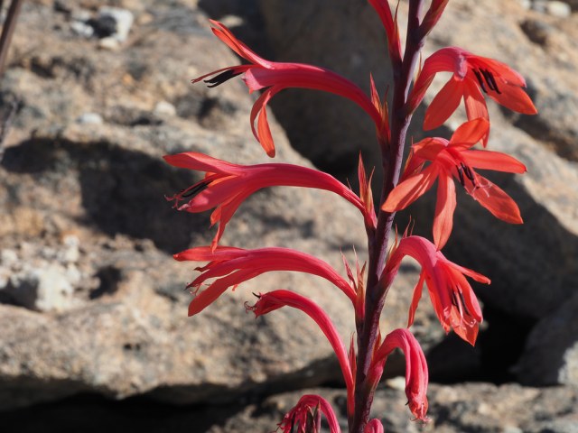 Watsonia vanderspuyae L.Bolus is found in the western Cape mountains at mid to upper elevations where it grows in rocky situations, often wedged in crevices where it is protected from predation. It grows to 2 meters and has broad leaves with thickened margins and large bright red long tubed flowers. It blooms infrequently in the wild and sometimes leaves are not produced unless there have been fires in the previous summer. The first photo was taken by Rod Saunders. The other photos from iNaturalist were taken by Felix Riegel in the Western Cape in October and shared under a CC BY-NC license.