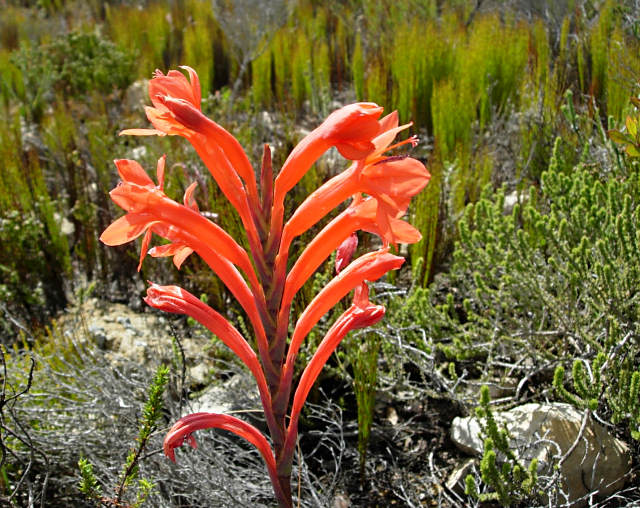 Watsonia spectabilis Schinz is native to sandy flats and plateaus, often found near water, from the Western Cape to the Agulhas Plains. It grows from 25 to 50 cm. high and has large tubular scarlet flowers in a few-flowered spike. Photos 1-3 were taken by Cameron McMaster near Napier in the Overberg. Photos 4-6 were taken by Andrew Harvie west of Stellenbosch in the Western Cape.