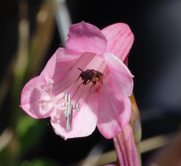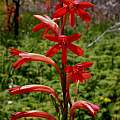 Watsonia aletroides (Burman fil.) Ker Gawler is a Cape species found on clay slopes in renosterveld and flowering in spring. It grows to 50 cm high with sword-shaped leaves and red, occasionally pink or mauve (rarely white) nodding tubular flowers in an unbranched spike. It flowers in spring and abundantly after fires. The first two photos are by Mary Sue Ittner of garden plants in Northern California where they are planted in the ground in the second picture next to Watsonia marginata leaves. The third and fourth pictures are by Rogan Roth of plants flowering abundantly in a seasonally wet and burnt area near the town of Swellendam, Western Cape. The fifth picture is of a very small pink form (under two feet / 0.7 m) grown in California by Michael Mace. There is a small bee hiding in the flower. This form blooms in late spring (mid-May) in California.