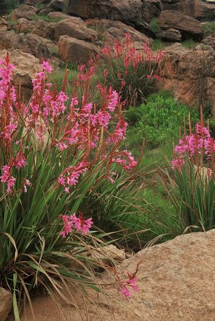 Watsonia emiliae L.Bolus is found on rocky outcrops in fynbos in the Langeberg and Swartberg Mountains. It grows to 60 cm, has narrow leaves and short tubed pink flowers, and flowers in summer. The photo below is from the book Plants of the Klein Karoo courtesy of Jan and Anne Lise Schutte-Vlok.