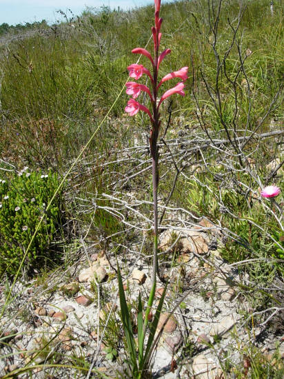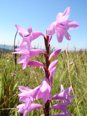 Watsonia distans L.Bolus is a rare plant found in only one remaining site in the Southwestern Cape where it grows in mountain marshes, flowering in late summer (November to December). Growing from 15 to 35 cm or taller, it has sword-shaped leaves and deep pink short-tubed flowers. Photo from Rod Saunders.