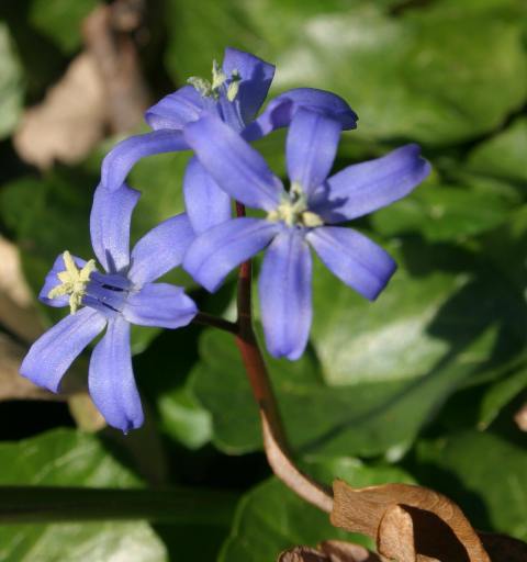 Shown below is an example of ×Chionoscilla which appeared spontaneously in the Montgomery County, Maryland, USA garden of Jim McKenney. Note the partially flattened filaments of the anthers and the gray-yellow pollen. The pollen color is a characteristic of Scilla bifolia, and flattened filaments are characteristic of the plants formerly called Chionodoxa. Early in the twentieth century, clonal ×Chionoscilla selections were named and traded. Height range: 10-20 cm.