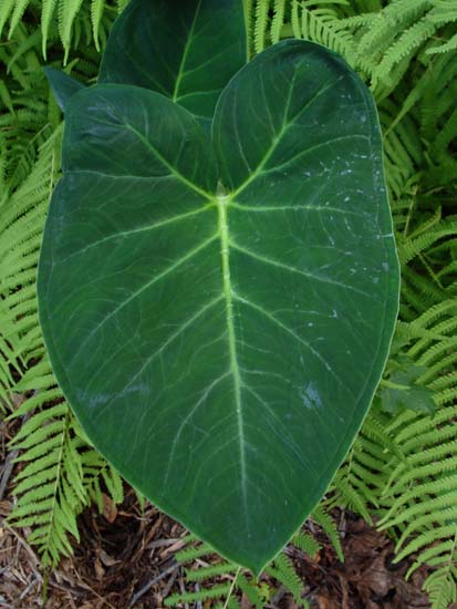 Xanthosoma Schott is a genus in the Araceae family native to Central and South America. Their large arrowhead-shaped leaves are ornamental, but the tubers of some species are also grown for food. They thrive in partially shaded conditions, but can take more light if the soil is moist enough.