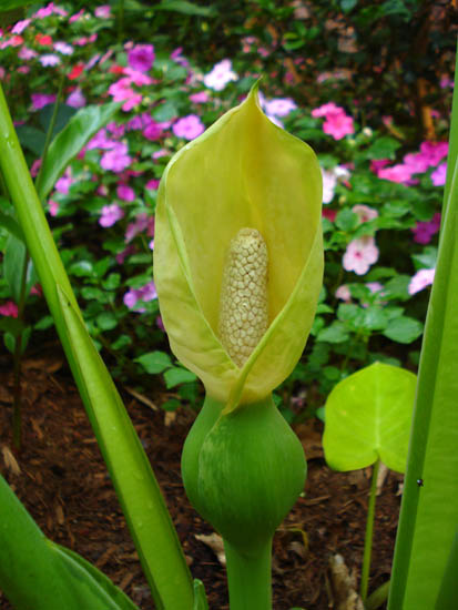 Xanthosoma 'Lime Zinger' has huge, glowing, chartreuse leaves. Height range: up to 7 ft tall. Photos taken August 2007 by Jay Yourch.