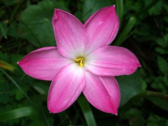 Zephyranthes 'Lydia Luckman' is a hybrid made by Fadjar Marta of Indonesia. The flowers are pink with a light stripe down the center of each petal. Photos taken September 2007 by Jay Yourch.