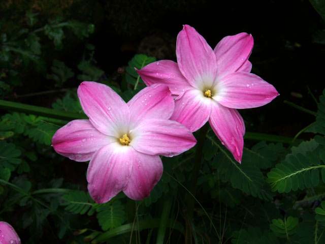 Zephyranthes 'El Cielo' (syn. Z. sp. El Cielo) was found in cloud forests in Mexico and may be a naturally occurring hybrid. It does well with more shade than most rain lilies. It's also unusual because it flowers for most of the growing season, although rarely heavily. Photos taken June 2004 by Jay Yourch & Alani Davis.