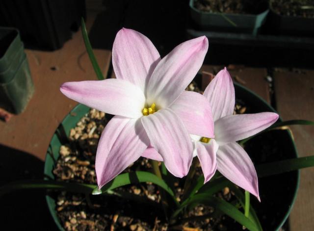 Zephyranthes 'Grandjax' is a hybrid of Z. grandiflora × Z. 'Ajax' (Z. candida × Z. citrina) with light pink flowers. It flowers abundantly and offsets readily, but is sterile. Photos taken July 2004 by Jay Yourch & Alani Davis.