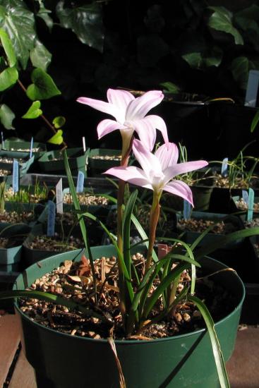 Zephyranthes 'Kathryn' is a hybrid of Z. 'El Cielo' × Z. 'Big Dude' made by Jay Yourch and named after his daughter. In most characteristics it is intermediate between its seed and pollen parents. Like its sister seedlings, its foliage is wider and more frost tolerant than Z. 'El Cielo' and it does not go through a mid-spring semi-dormancy as do most selections of Z. 'Labuffarosea'. These photos were taken in the evening when the flower had begun to close, it opens flat in brighter light. Photos taken May 2009 by Jay Yourch.