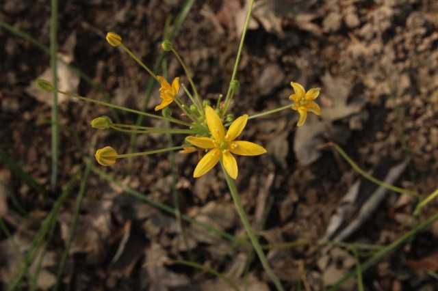 Bloomeria crocea (Torr.) Coville is found in chaparral, coastal sage scrub, Valley grassland, southern oak woodland, foothill woodland, and yellow pine forest from central California to Baja. It flowers April to June. Height: about 60 cm. There are three varieties: Bloomeria crocea var. aurea (Kellogg) Ingram, Bloomeria crocea var. crocea, and Bloomeria crocea var. montana (Greene) Ingram. They are distinguished by the size of the nectar cup and variations in the filaments. It is shown in various stages of bloom in the pictures shown below. Bloomeria looks good massed and blends nicely with other yellows and with the blues of Triteleia, Dichelostemma, Dipterostemon, and Brodiaea. The first 4 photos below were taken by Bob Rutemoeller and Mary Sue Ittner. Photo 1 is when it was in bud and a Dichelostemma multiflorum is coming up through the umbel and Triteleia ixioides is below. In photo 2 the flowers are starting to open. In photo 3 the flowers are fully open and in the last picture it is growing with Triteleia laxa. The leaves have all dried up by this time. Photos 5-6 were taken by Nhu Nguyen showing a closeup of the petals and pollen, and the whole umbel.