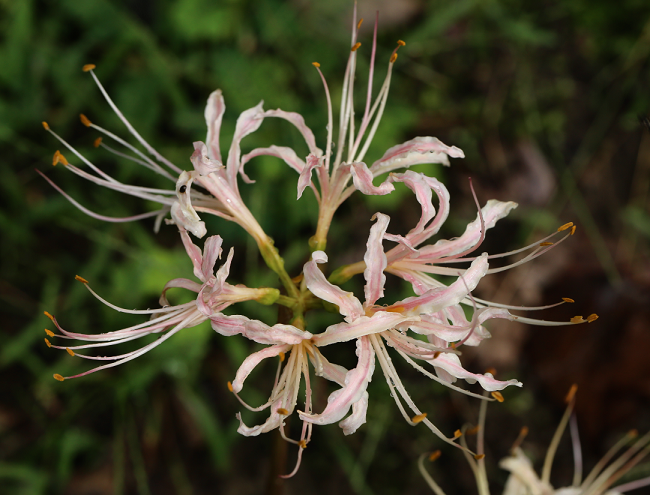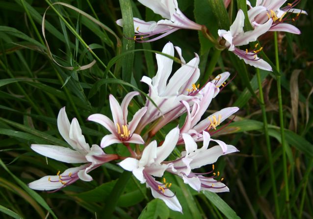 Lycoris incarnata Comes ex Sprenger is sometimes called Peppermint Lycoris because it has red and white striped buds and flowers. Unlike many Lycoris, this one is reported to require a hot, dry resting period to flower well. It clumps up rapidly and produces dense displays of flowers. It is a good selection for northern gardens as it is hardy to Zone 5. Height range: 30-60 cm.Photos by Rob Hamilton, Jay Yourch, and Jim Murrain, and Jim Waddick. Notice the striped buds and pink midline on the inside and outside of the petals.