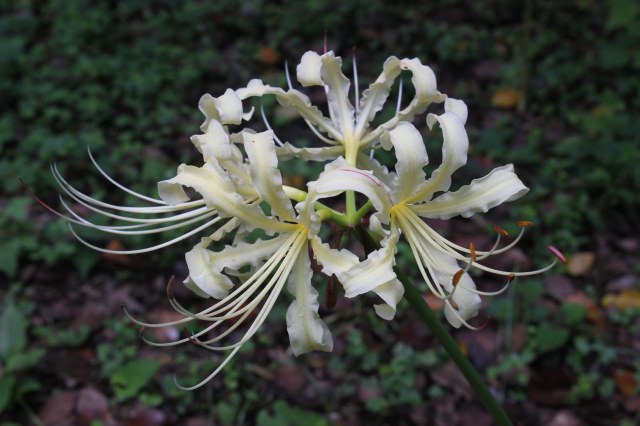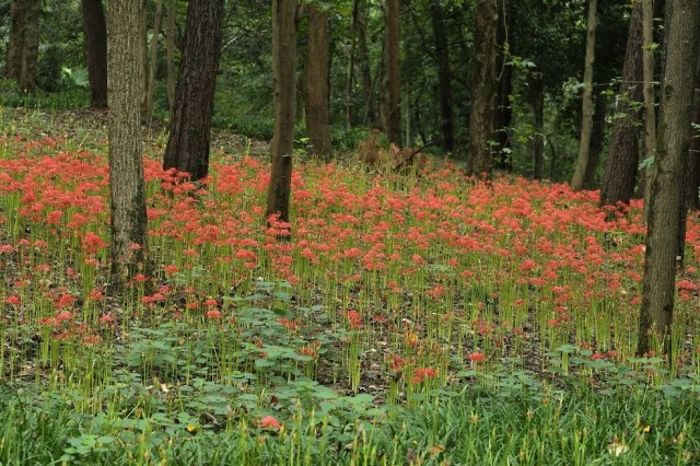 The first three photos of Lycoris radiata var. radiata were taken by Mari Kitama in the Kinchakuda and Gongendo parks in Japan in September 2010. Kinchakuda, a flat field surrounded by the Koma River was originally a natural habitat for this species. Many years ago people removed other plants so it would just display Lycoris radiata. It is estimated that there are now more than one million bulbs in this location. Gongendo was made into a bank to prevent a flood of the Gongen river about 430 years ago. It was not a natural habitat for this species; they were planted starting about the year 2000. The last The photo of L. radiata var. radiata was taken by Zhang Pengchong in Hangzhou Botancial Garden where it is planted on a gentle slope under a deciduous broadleaf forest.