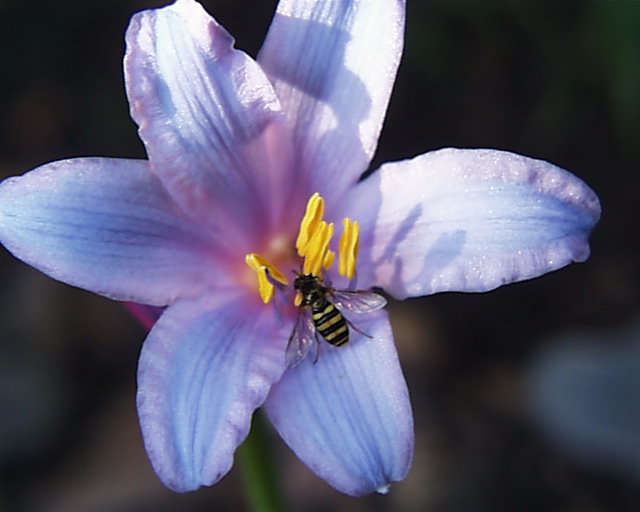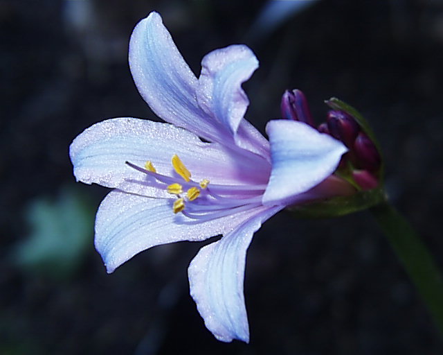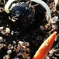Here are photos of two separate scapes from the same bulb (from Jim Waddick) blooming once again in southern California, showing how the amount of blue can change from scape to scape. The first scape (first photo) bloomed when the temperatures were very hot, mid-to-high 90s F. (high 30s C.), and are more pink. The second scape (second and third photos), which bloomed when the temperatures were unusually low for August, upper 70s F. (mid 20s C.) are much more blue. The electric-blue buds are particularly spectacular. The last flower photo is of Lycoris sprengeri and Lycoris radiata blooming together, showing contrast between Lycoris flower form and color. Photos taken August 2004 by Lee Poulsen. In photo 5 a Lycoris sprengeri seed from Jim Waddick via PBS BX 297-4 is germinated by M. Gastil-Buhl, with toothpick in foreground included for scale. Photo 6 shows bulblets 2 cm long by 0.5 cm wide 7 months later in July.