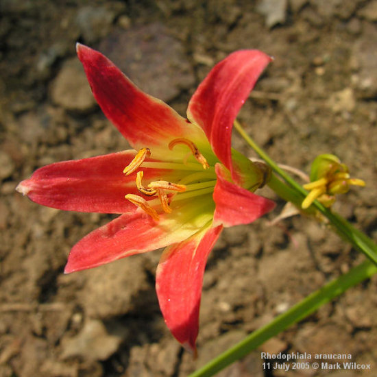 Rhodophiala araucana (Phil.) Traub (or Zephyranthes araucana (Phil.) Nic.García) is a summer-grower. It is reported to be polyploid (2n=54). Seedlings have produced various shades from very pale pink (near white) to peach and bright scarlet-red. Height range: 12-25 cm. Photo one by Den Wilson. Photo two is grown from seed acquired from IBS, labeled 9-13-01, but not planted until January 2002. Has been under lights the entire time, the first flower in full bloom, 04-11-2003. Photo by Kelly Irvin. Photo three is the second of only two seed survivors in the before mentioned acquisition, photo taken 05-16-2003. This inflorescence has 3 blooms instead of 2. Amazing how different a sibling can be. Photo by Kelly Irvin. And picture four is another plant showing how incredibly variable this species can be. Photo taken on 11 July 2005 by Mark Wilcox.