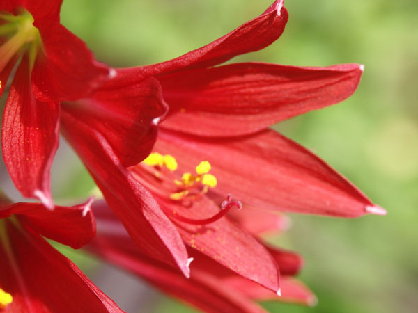 Rhodophiala pratensis (Poepp.) Traub (or Phycella chilensis (L'Hér.) Grau ex Nic.García) from Chile has scarlet flowers that are yellow at the base. It blooms in early summer with leaves present. Height range: 40-60 cm. Photos by Den Wilson and Mary Sue Ittner. The last photo was taken at Telos Rare Bulbs.