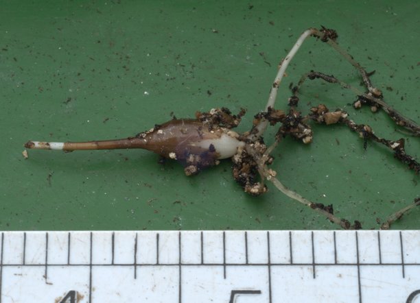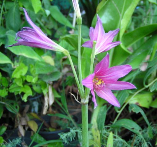 The two photos below by Uluwehi Knecht show a pink form raised from from BX 174 seeds. This bulb reached blooming while growing in a narrow pot (7.3 cm wide x 22.9 cm tall). It was planted into this pot as a seedling near the surface but by the time it finally reached blooming, it had moved itself down to the very bottom of the pot with its basal plate near the base of the pot. This form is self-fertile.