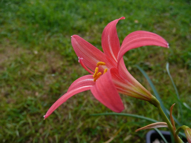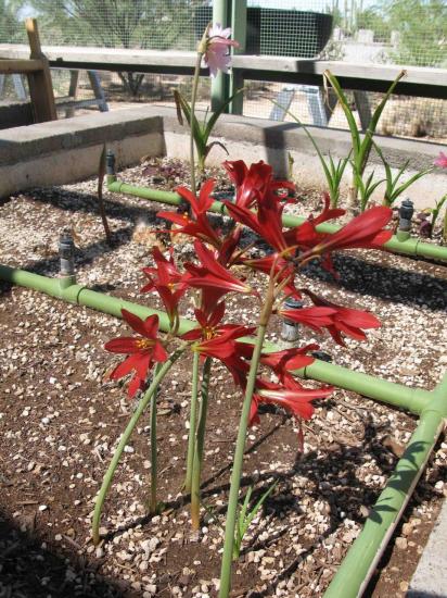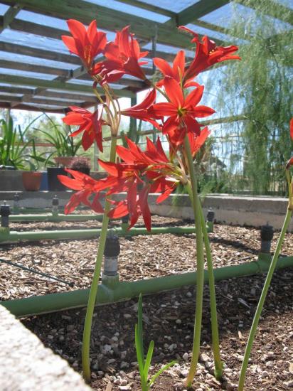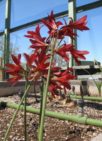 Rhodophiala bifida 'Hill Country Red' (previously known as "Texas red form") is a vigorous form commonly available in cultivation. It is thought that this form is self-sterile because of its (poly)ploidy. However, it may simply be that the form requires another clone for seed production. Reports from Bill the Bulb Baron, Tony Avent, and Alberto Castillo confirm that this red form can make seeds (although not vigorously) when crossed with other forms. This form is a vigorous grower and does best in the ground. When grown in pots, it requires a lot of room, otherwise it will split its pot in a few years. Photo 1 was taken by Lee Poulsen. Photo 2 was taken by Mark Wilcox in September 2005 of plants obtained from Plant Delights Nursery. Photos 3-4 were taken Uluwehi Knecht.
