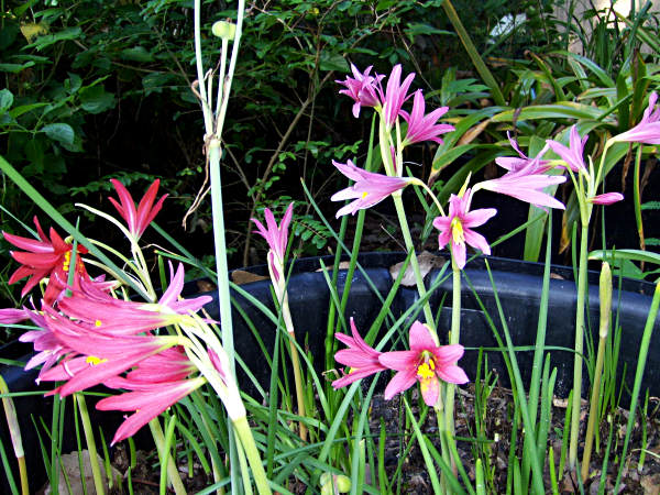 Photos 1-2 were taken in 2003 by Lee Poulsen from bulbs obtained from Old House Gardens. The lighting adds more blue to the photos, making the flowers more purple than red. Photo 3 was taken by Patty Allen showing some of the pink forms she grows.