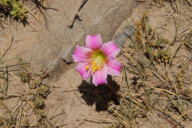 Rhodophiala ananuca (Phil.) Traub (or Zephyranthes ananuca (Phil.) Nic.García) is a species from northern Chile where it grows in coastal areas that are extremely dry, sometimes receiving no rain at all although there are coastal fogs. The photos below were taken spring 2011 in a year with good rainfall by Eugene Zielinski. He remarked that it grew abundantly in white sands between Huasco and Carrizalillo. Flowers ranged from white to a pronounced pink, usually with darker veins. Height range: 15-60 cm.
