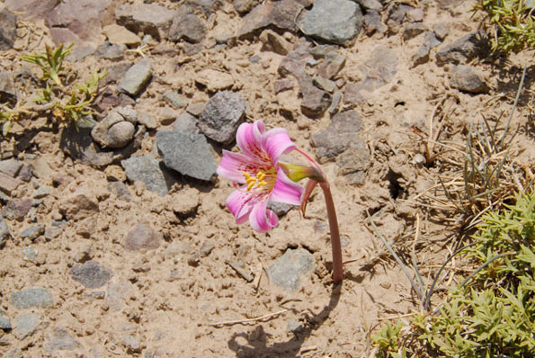 Rhodophiala andicola (Poepp.) Traub (or Rhodolirium andicola (Poepp.) Ravenna) is found in pumice sand, cinder slopes and tussock meadows from 1800-2100 m in the Andes of Chile and Argentina. Growing from 12 to 22 cm, it has bell shaped pinkish red flowers. Photo taken by Chris Mallek at Conguillio National Park, Chile.
