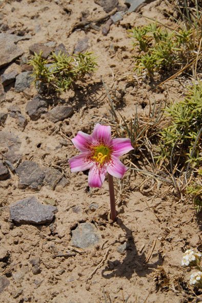 Rhodophiala rhodolirion (Baker) Traub (or Rhodolirium montanum Phil.) is a beautiful alpine species from the Chilean and Argentinean Andes where it grows in rocky places and spends the winter under snow. It has white or pink flowers with a greenish-yellow base and crimson guide lines often broken into streaks and dashes. Leaves appear after flowering. Height range: 10-25 cm. Photo by Osmani Baullosa.