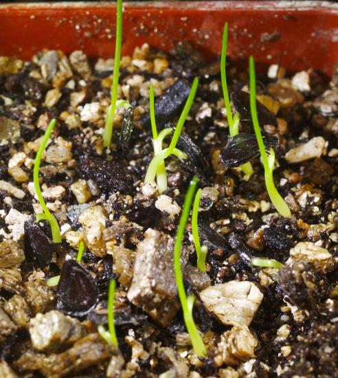 To grow from seed, material must be sown as fresh as possible. Seeds can be floated in water with good germination (Cathy Craig). Good seeds will germinate in 2-3 days. However, they can be sown directly under 3-5 mm (1/8-1/4 inch) of potting mix with good results (Nhu Nguyen). Sowing of seeds must coincide with the growing season. For some high altitude species, seeds may need to be stratified before germination will occur. This can be done by soaking the seeds in water overnight, wrapping the seeds in a moist paper towel, and placing inside a plastic bag in the refrigerator. Check periodically for germination. When the radicle appears, pot up the germinated seeds. Seedlings will grow well with a little dilute fertilizer and may remain in growth for the first 2 years. These plants are known for their preference of deep pots and will usually put their bulbs at the bottom of even very deep pots. Adult bulbs should be grown in a low organic mix (1:3 organic:inorganic). Some species (like the desert species) may rot if kept in excessive rain. Grow these in a very well draining mix (1:9 organic:inorganic) in a terracotta pot. If organic material is low, fertilization with a high P low N mineral fertilizer may be necessary. Photographs of seed (10 mm grid) by David Pilling, the second (of the same seeds) using strong transmitted light reveals the embryos, the final photo shows the resulting seedlings a couple of weeks later.
